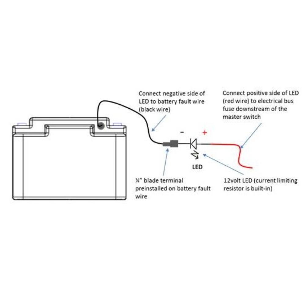 Connect the positive wire (red wire) of the LED to the electrical bus (12volt positive), typically to a fuse/breaker downstream of the master switch. Connect the negative of the LED (black wire) to the fault monitor wire (wire out the side of the battery) of the battery.